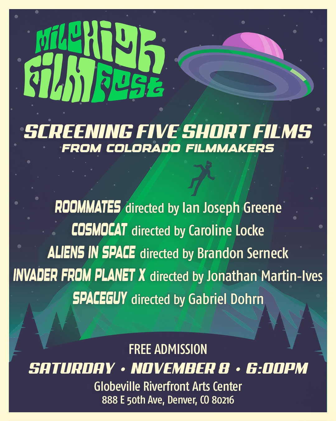 Screening 5 short films made in Colorado. Featuring Sci-Fi, UFO, and Outer Space Films.